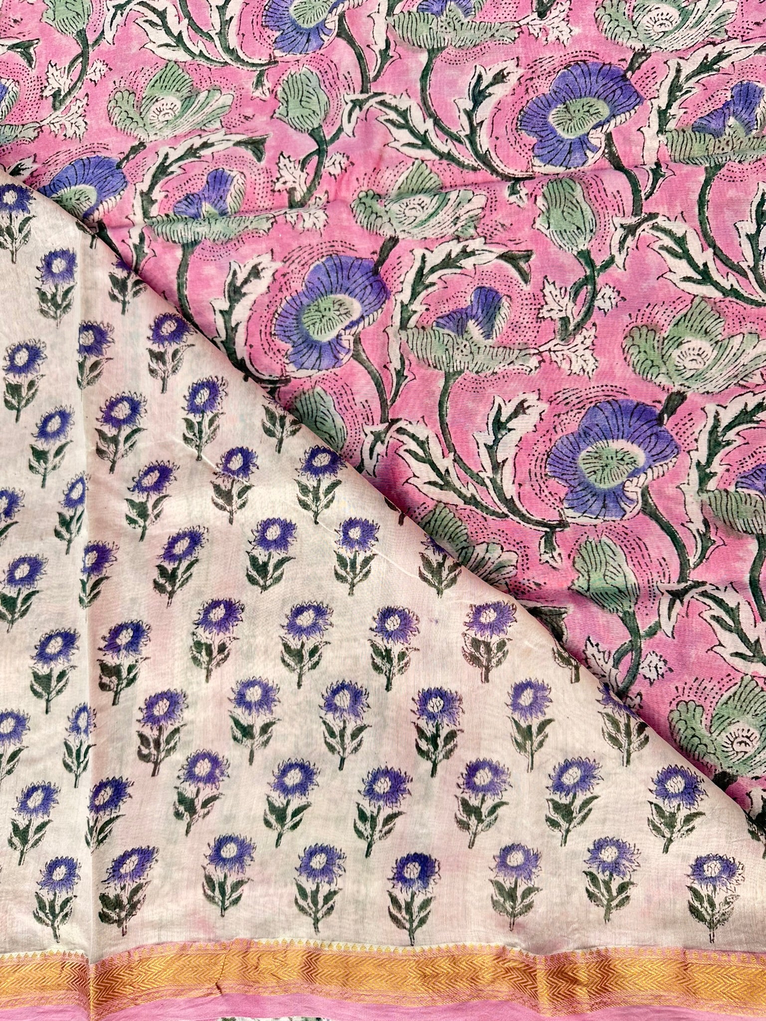 A refined blend of heritage and contrast, this Maheshwari silk saree features a floral block print with pink base colour that adds timeless charm. Woven in authentic, feather-soft silk, the saree is lightweight, breathable, and effortlessly graceful—perfect for both everyday sophistication and special occasions. Finished with classic Maheshwari detailing, it drapes fluidly and makes a statement.