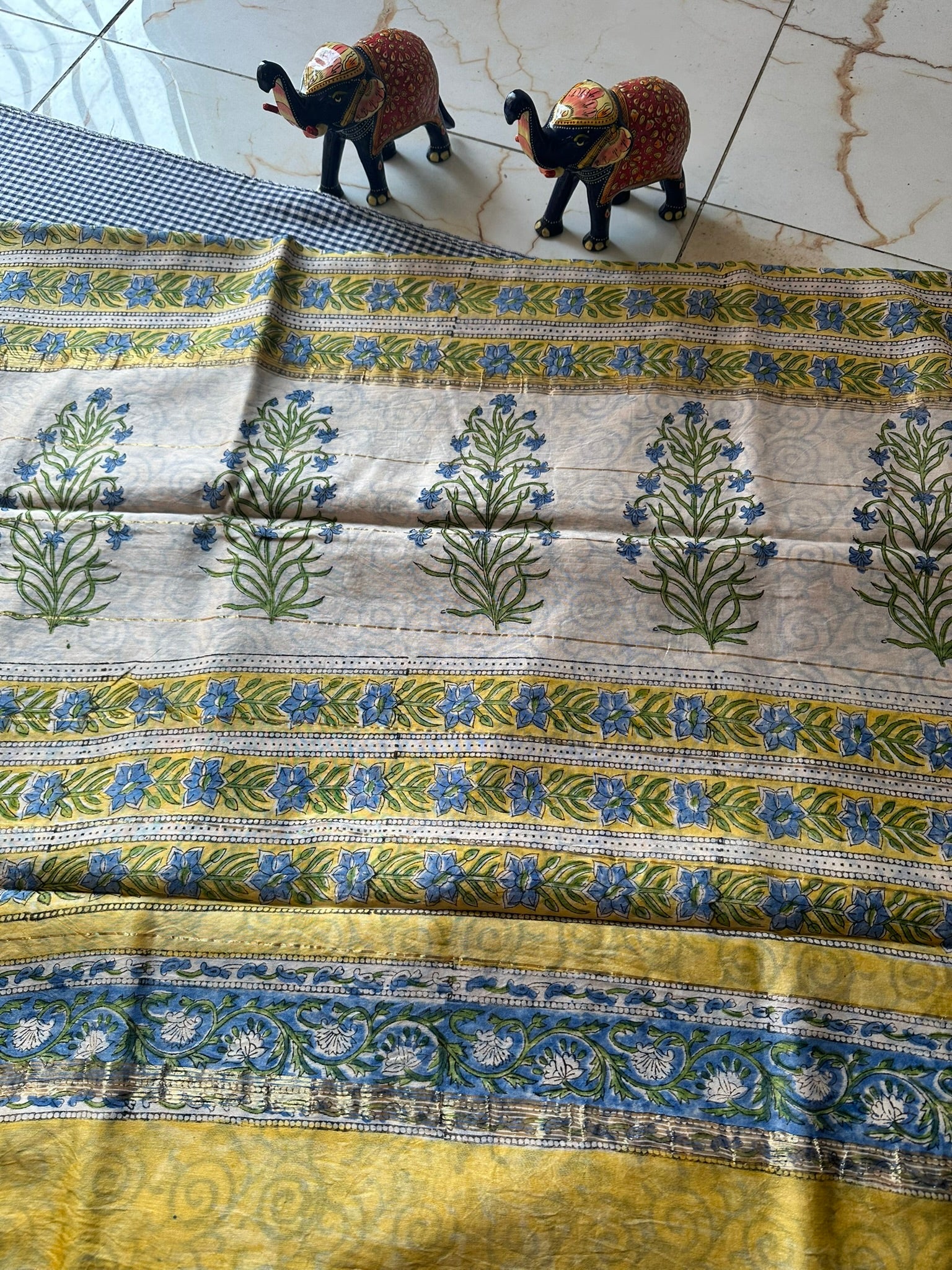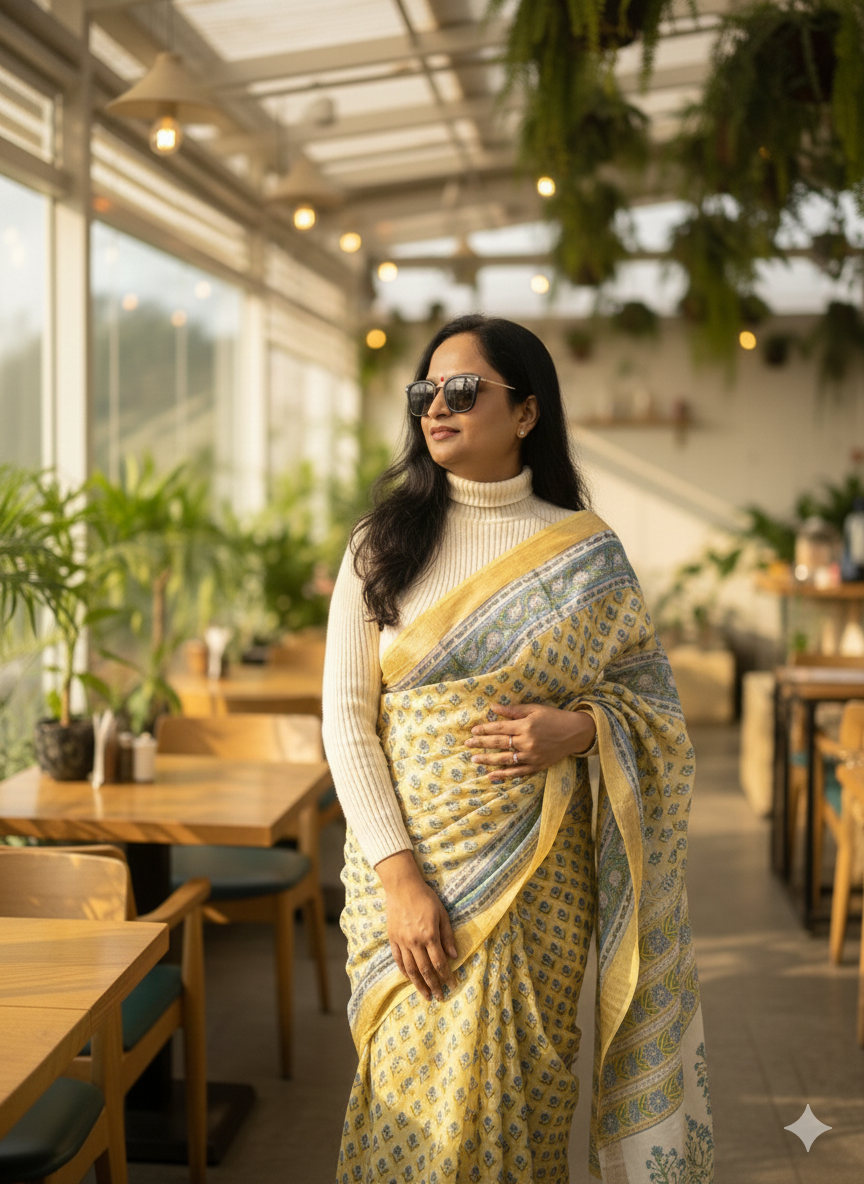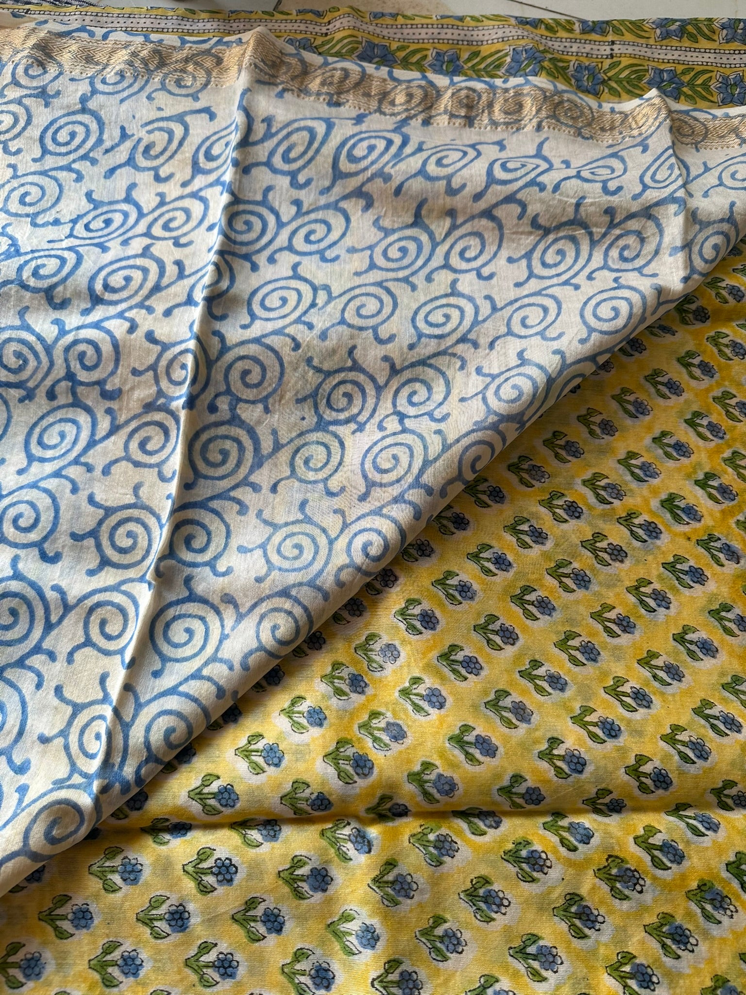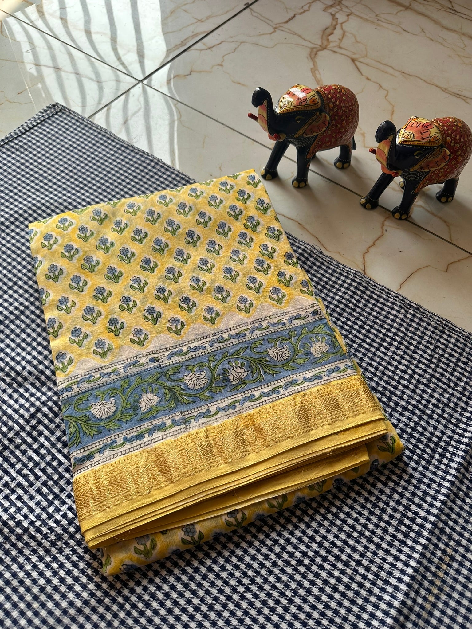 An elegant yellow colour Maheshwari silk saree featuring delicate and small floral hand block prints, crafted in a traditional silk–cotton blend. Lightweight with a subtle sheen, it offers a graceful drape and timeless appeal—perfect for festive and cultural occasions. Each saree is handcrafted, making every piece unique.