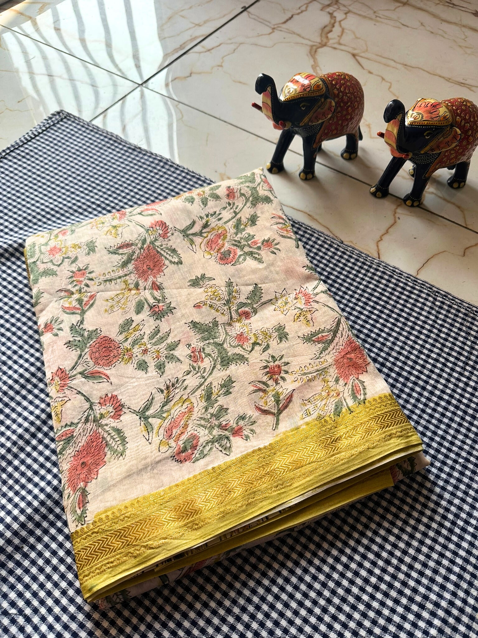 An elegant Maheshwari silk saree featuring delicate floral hand block prints, crafted in a traditional silk–cotton blend. Lightweight with a subtle sheen, it offers a graceful drape and timeless appeal—perfect for festive and cultural occasions. Each saree is handcrafted, making every piece unique.