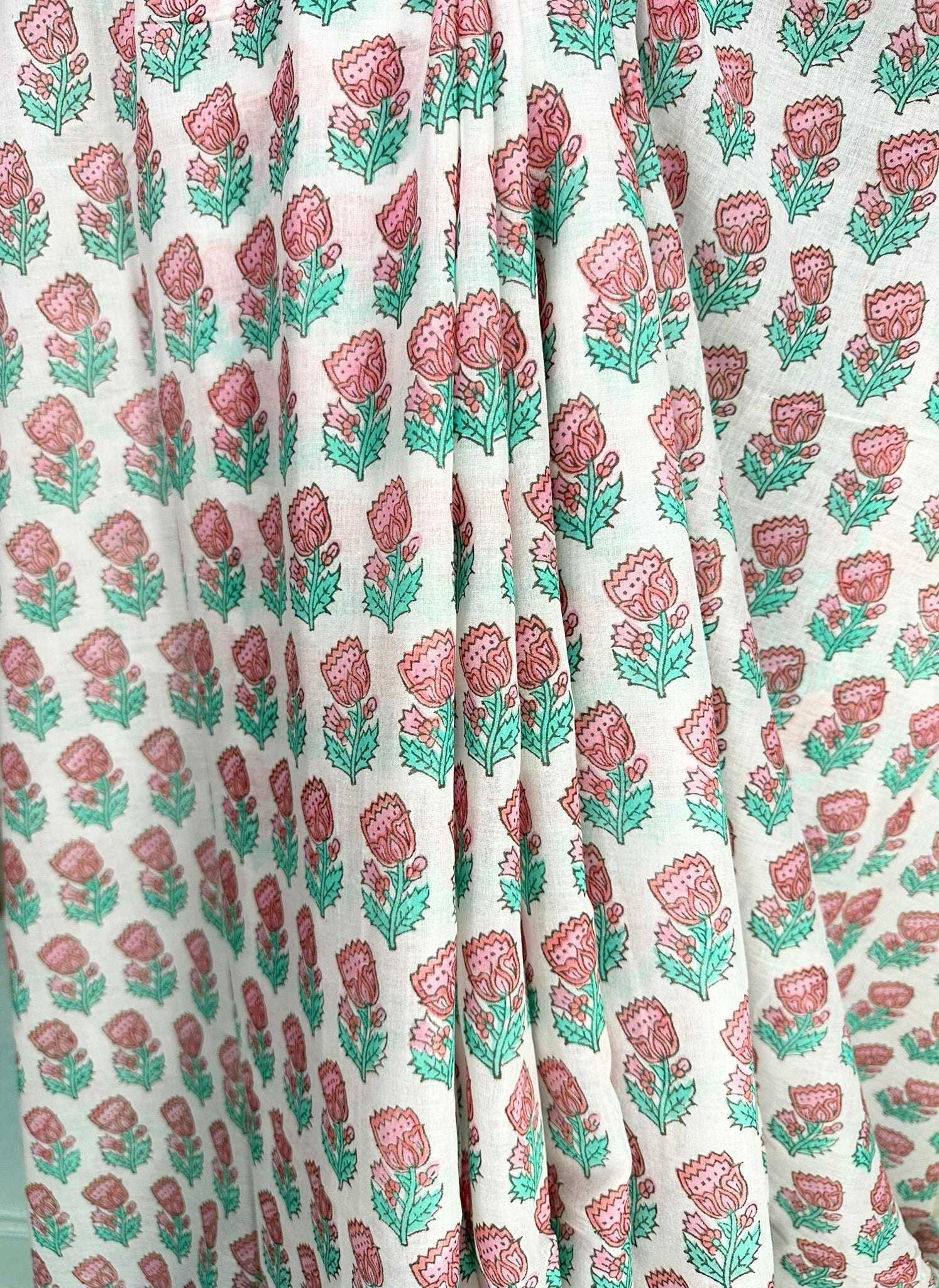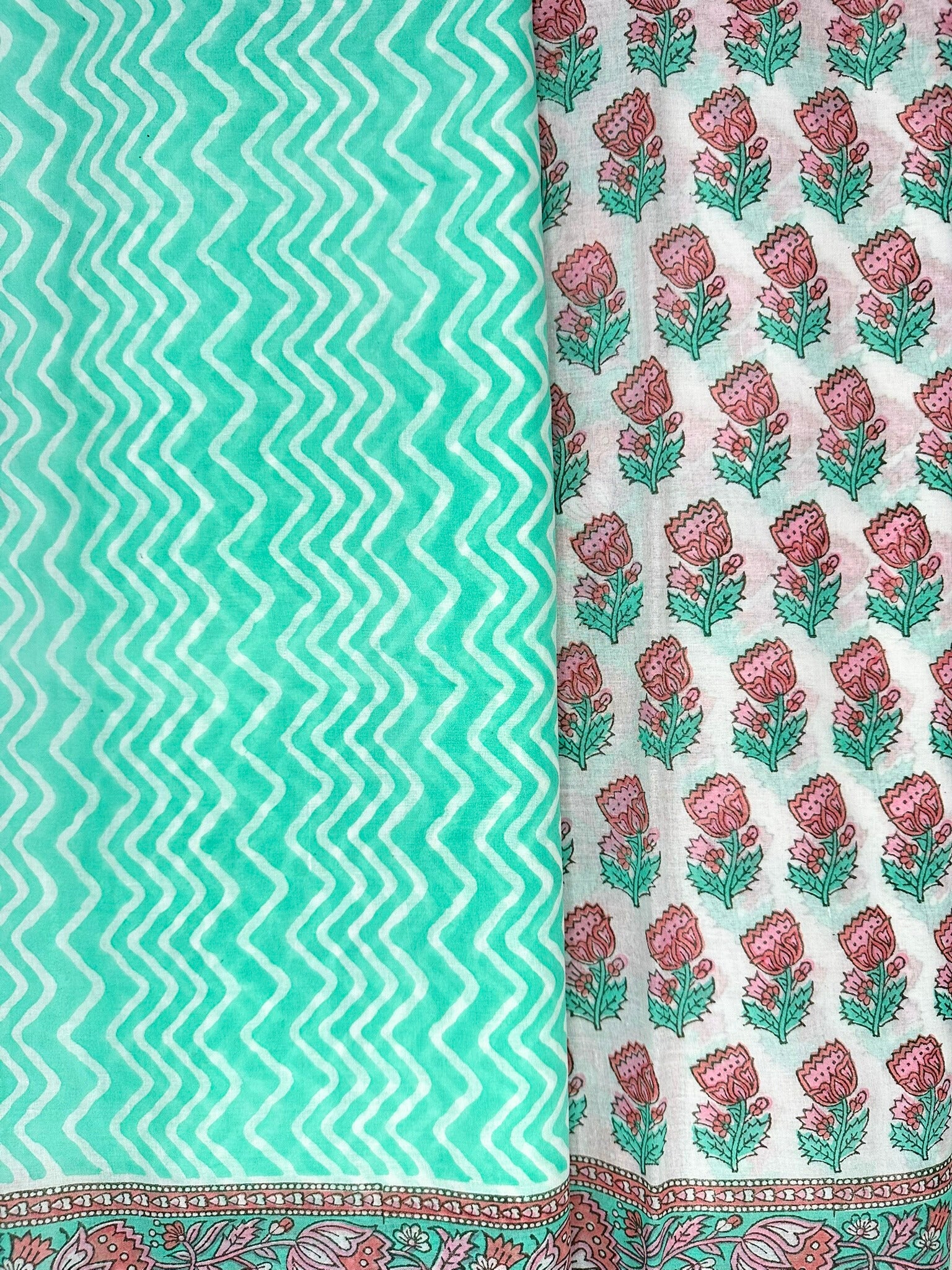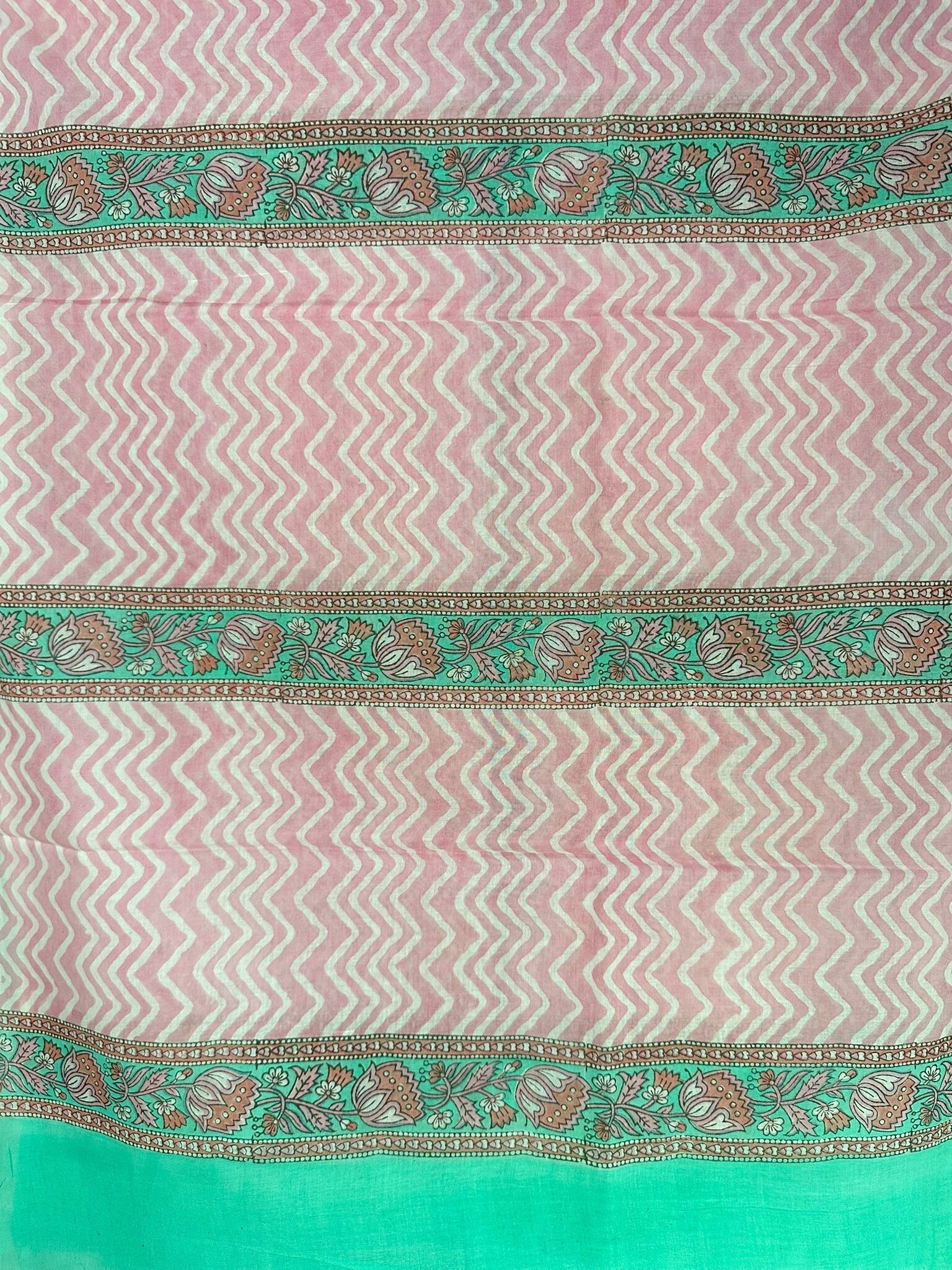 This mul cotton saree features a pristine white base beautifully adorned with hand block printed pink florals, creating a fresh and elegant look. Crafted from ultra-soft and breathable mul cotton, it drapes effortlessly and offers all-day comfort. The delicate floral detailing brings a graceful charm, making this saree perfect for daytime outings, festive gatherings, and effortless everyday elegance. Contrasting green blouse and pink pallu gives a very distinguishing look to the saree.