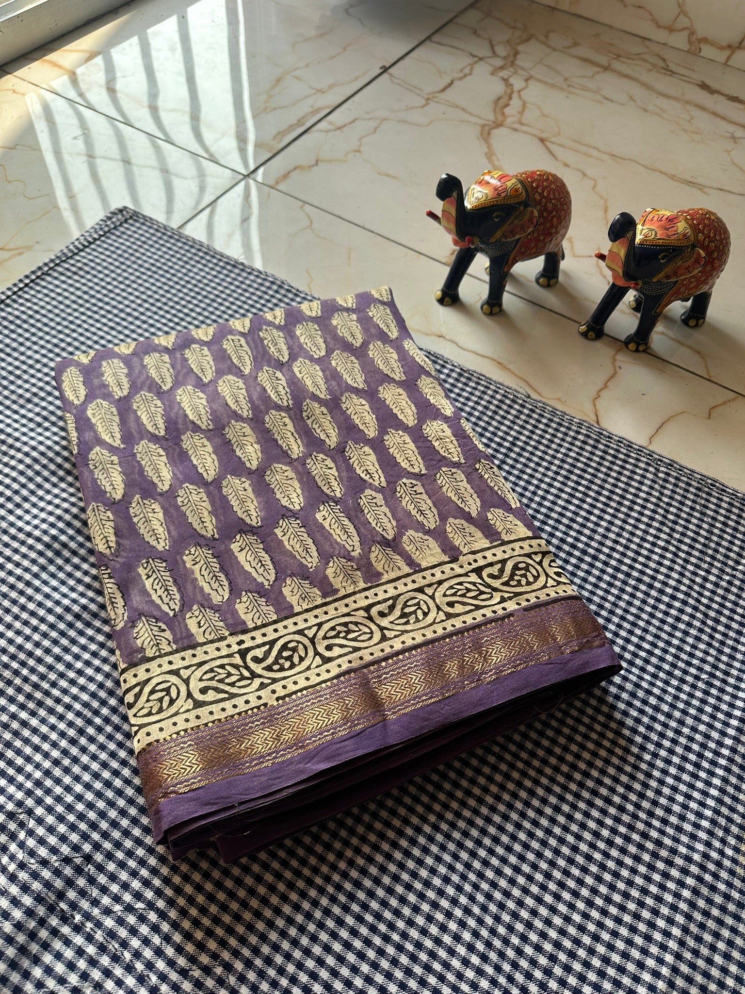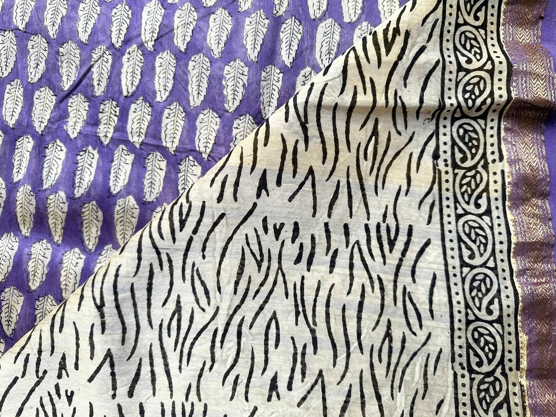 An elegant purple colour Maheshwari silk saree featuring leaf motifs and hand block prints, crafted in a traditional silk–cotton blend. Lightweight with a subtle sheen, it offers a graceful drape and timeless appeal—perfect for festive and cultural occasions. Each saree is handcrafted, making every piece unique.