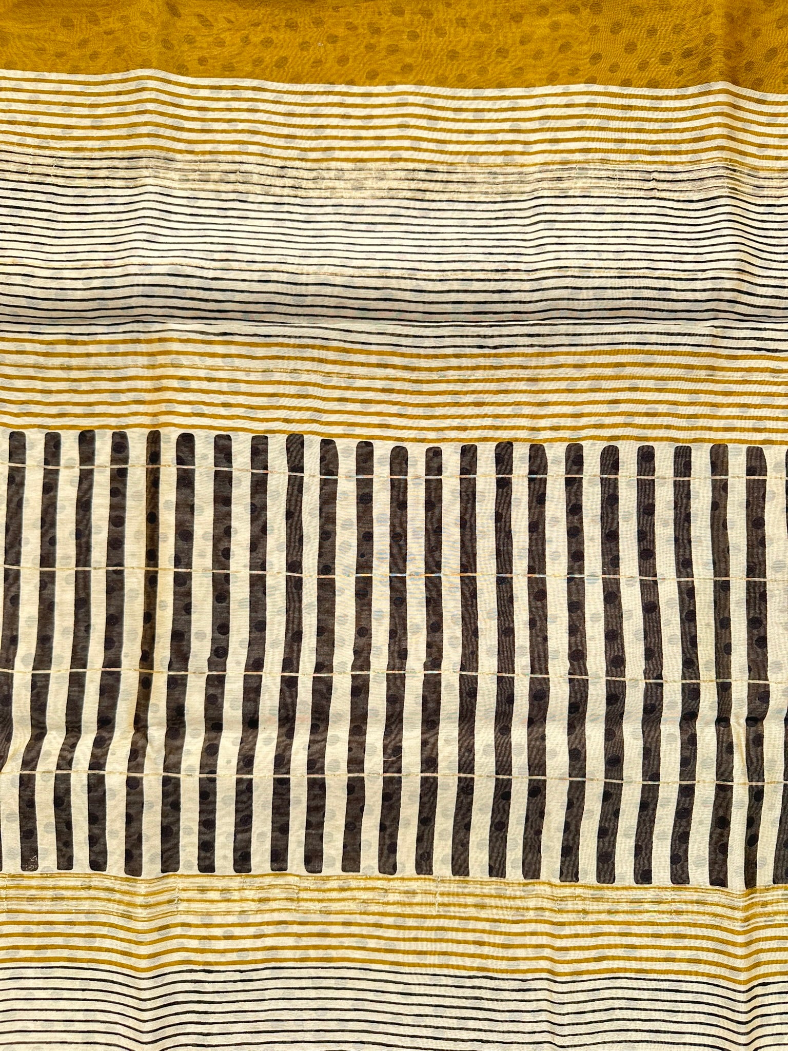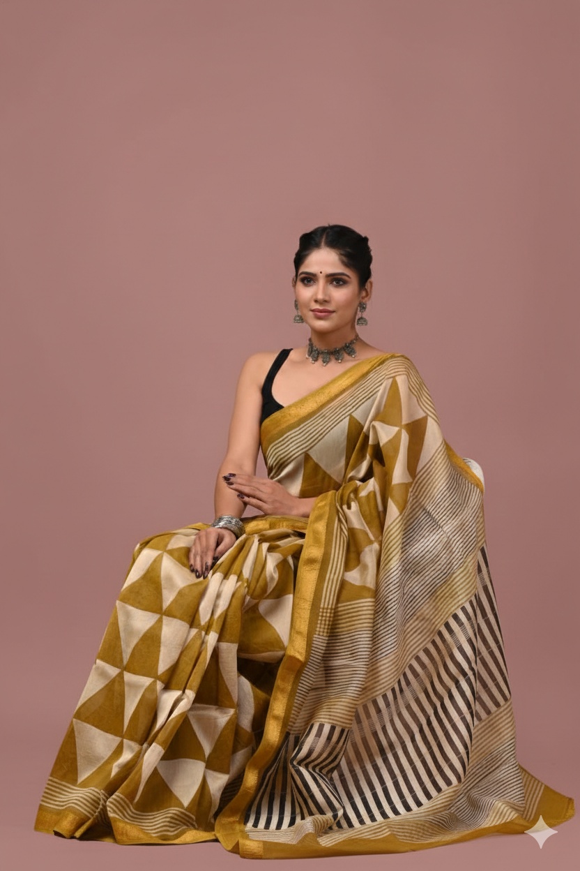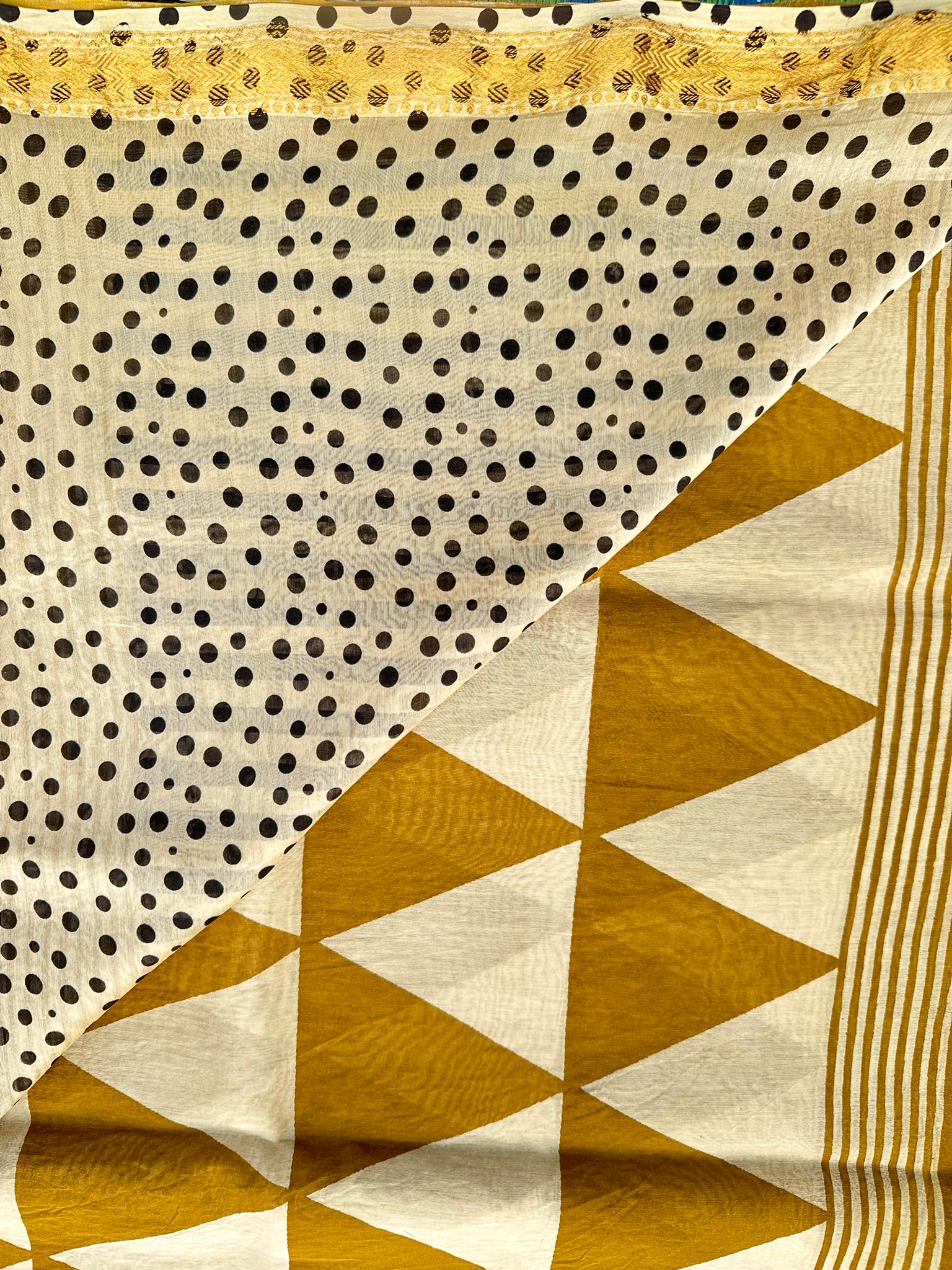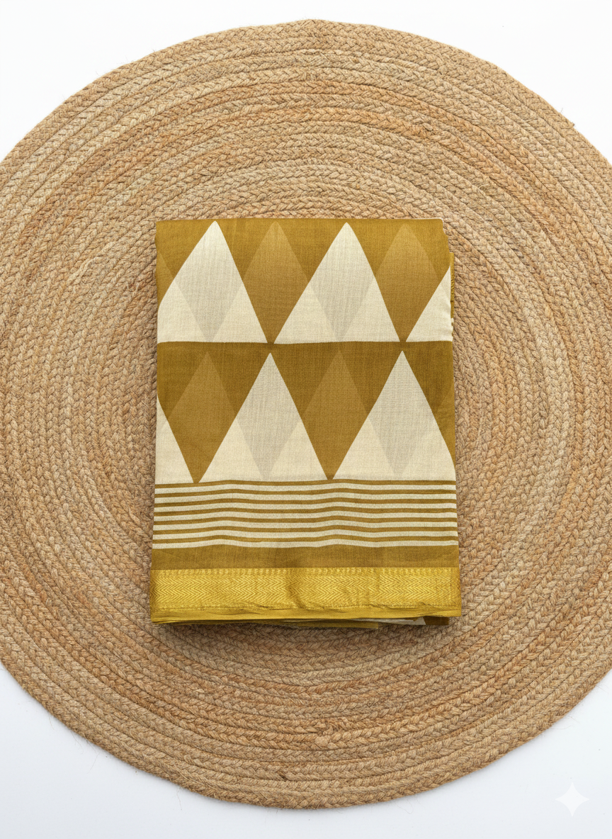 A refined blend of heritage and contrast, this Maheshwari silk saree features a geometric block print with mustard and white triangles that adds timeless charm. Woven in authentic, feather-soft silk, the saree is lightweight, breathable, and effortlessly graceful—perfect for both everyday sophistication and special occasions. Finished with classic Maheshwari detailing, it drapes fluidly and makes a statement.