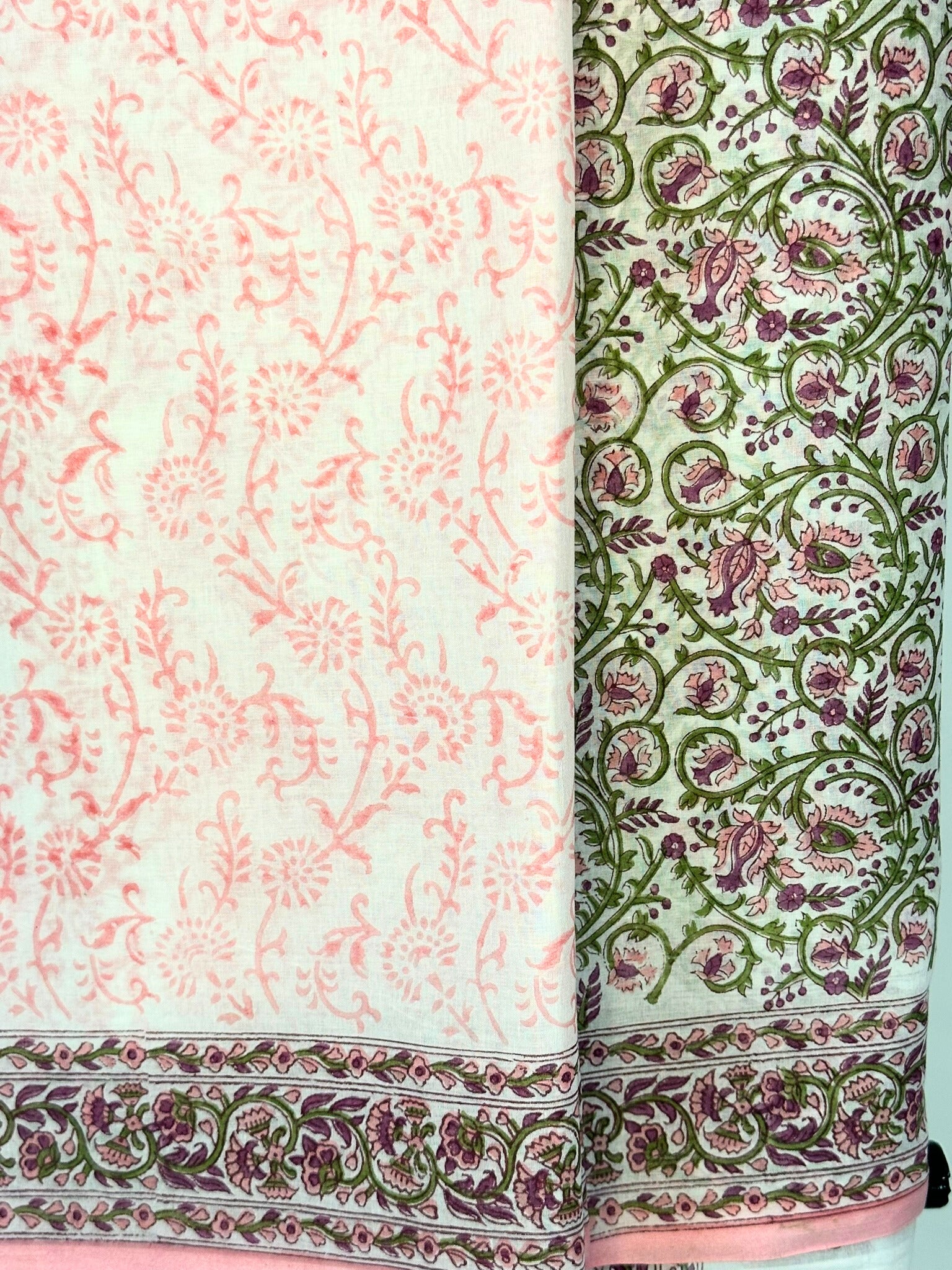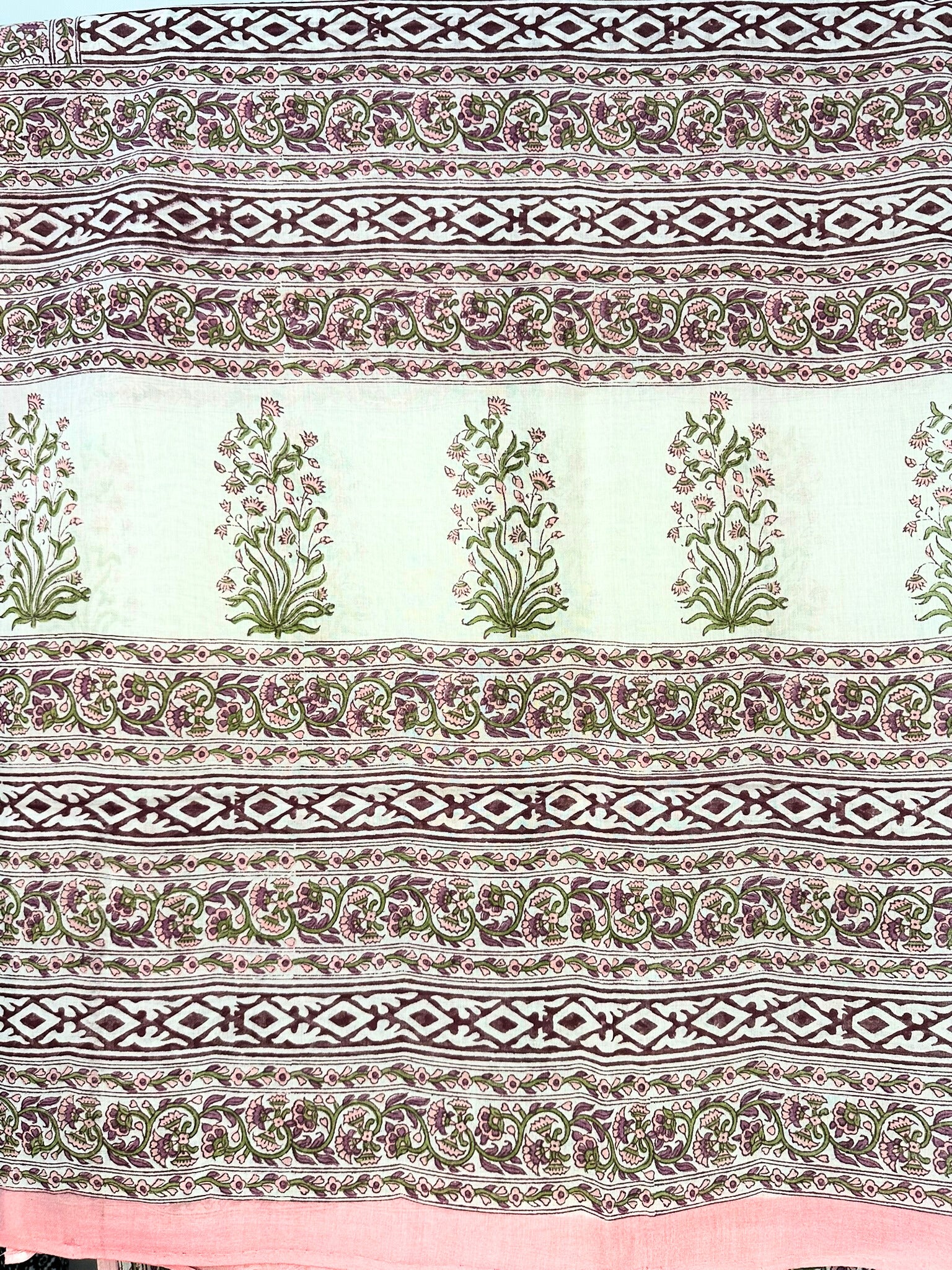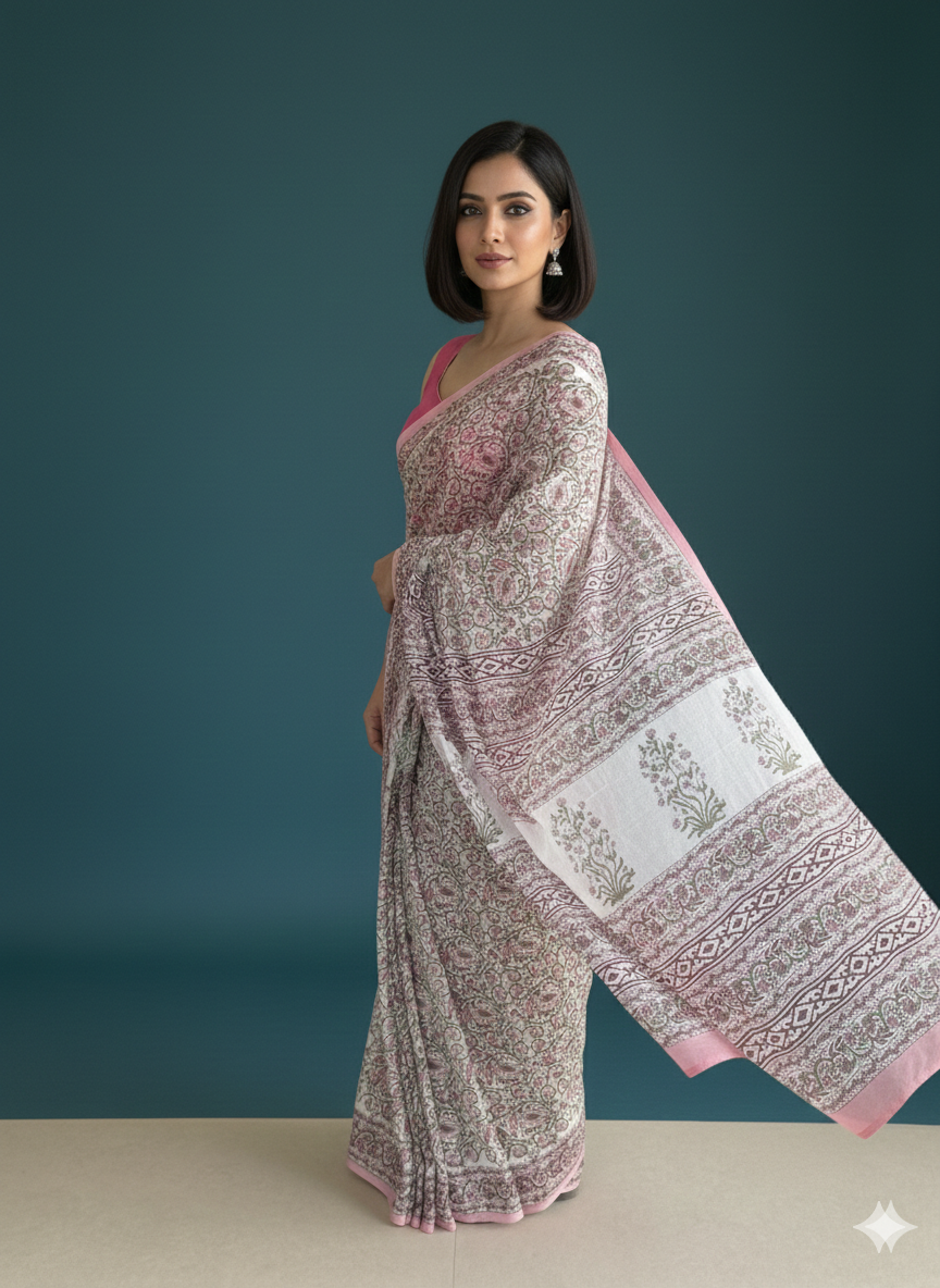 Beautiful masterpiece of hand block printing to give you that chic look. The floral prints on white base are highlighting the intricate design of the florals which would outshine as you carry it like a breeze. The blouse along with border detailing adds on to the grace of the saree.