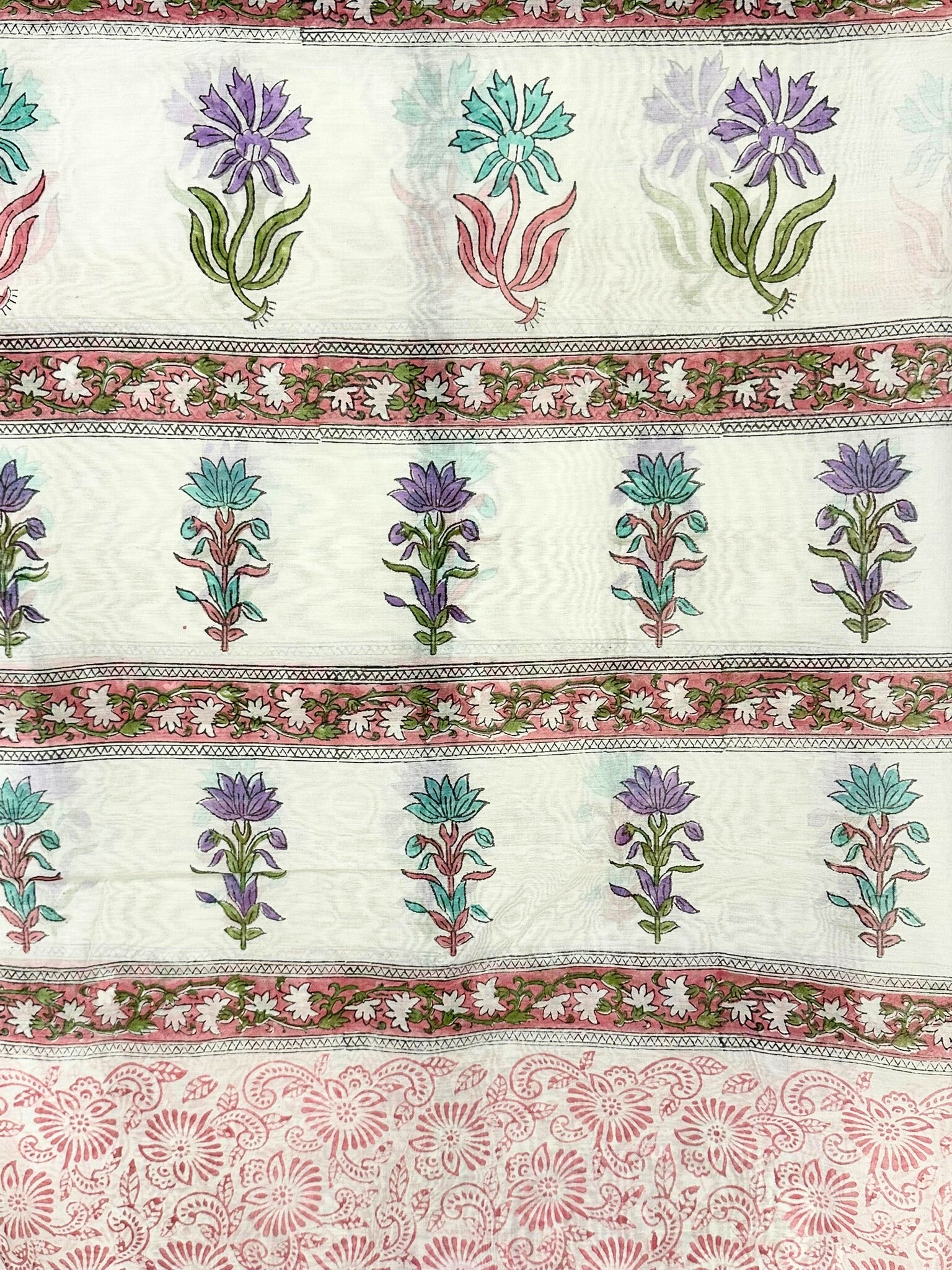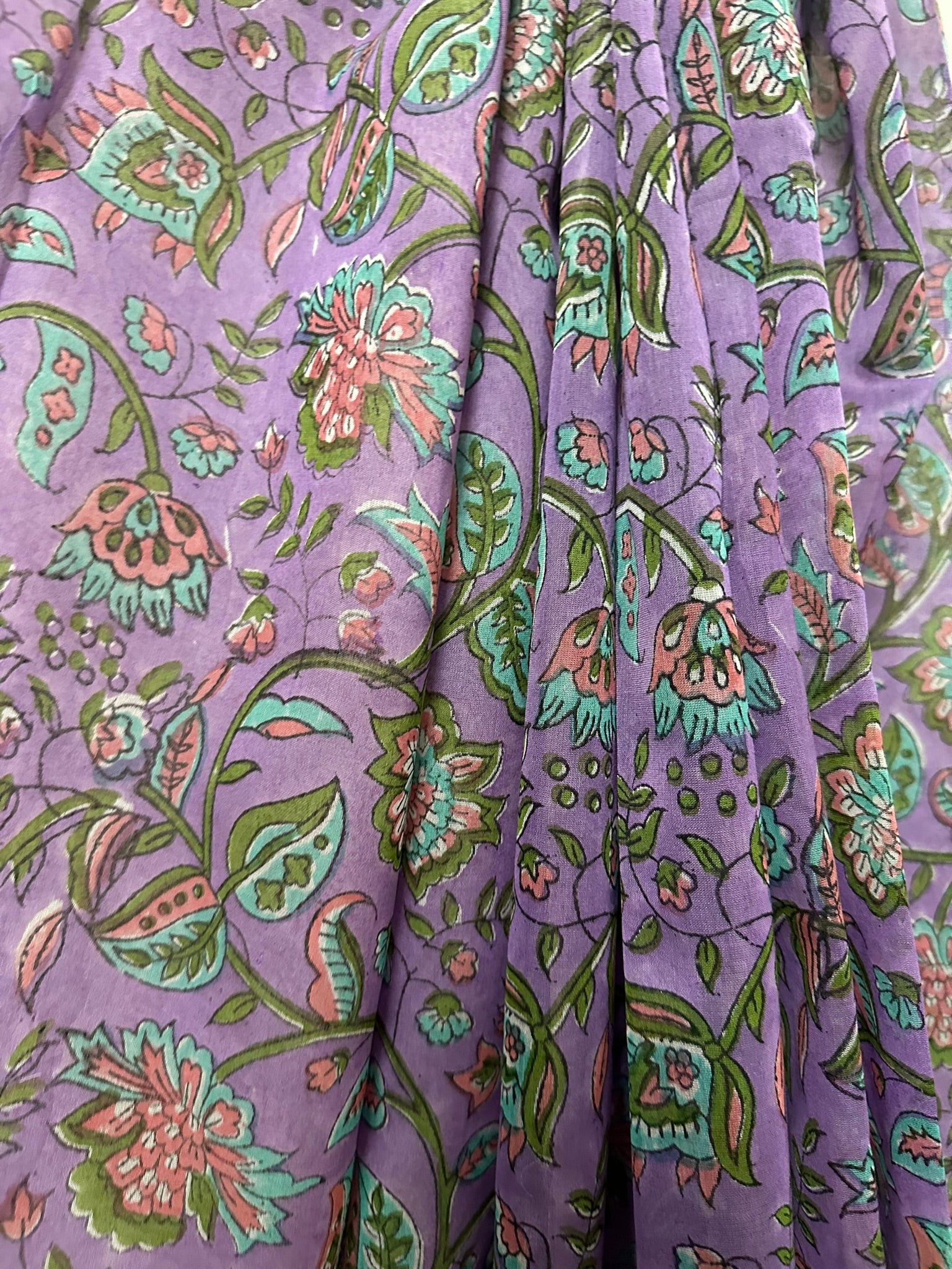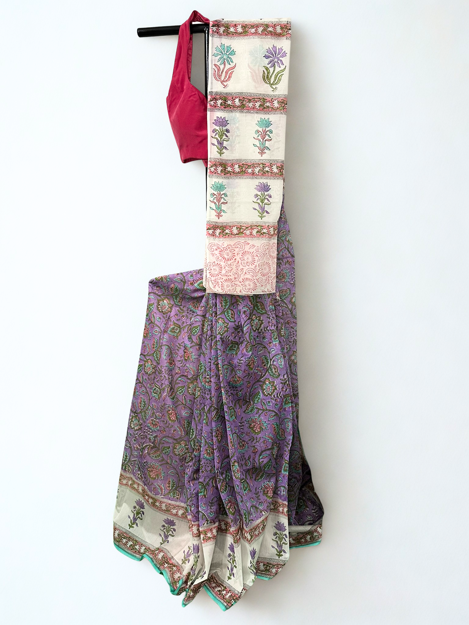 This floral hand-block printed saree features a rich purple base that beautifully enhances the colors used in the intricate design and detailing. The contrasting blouse further elevates the look, adding a striking finish to the overall ensemble. Best to go with day functions or casual outings.