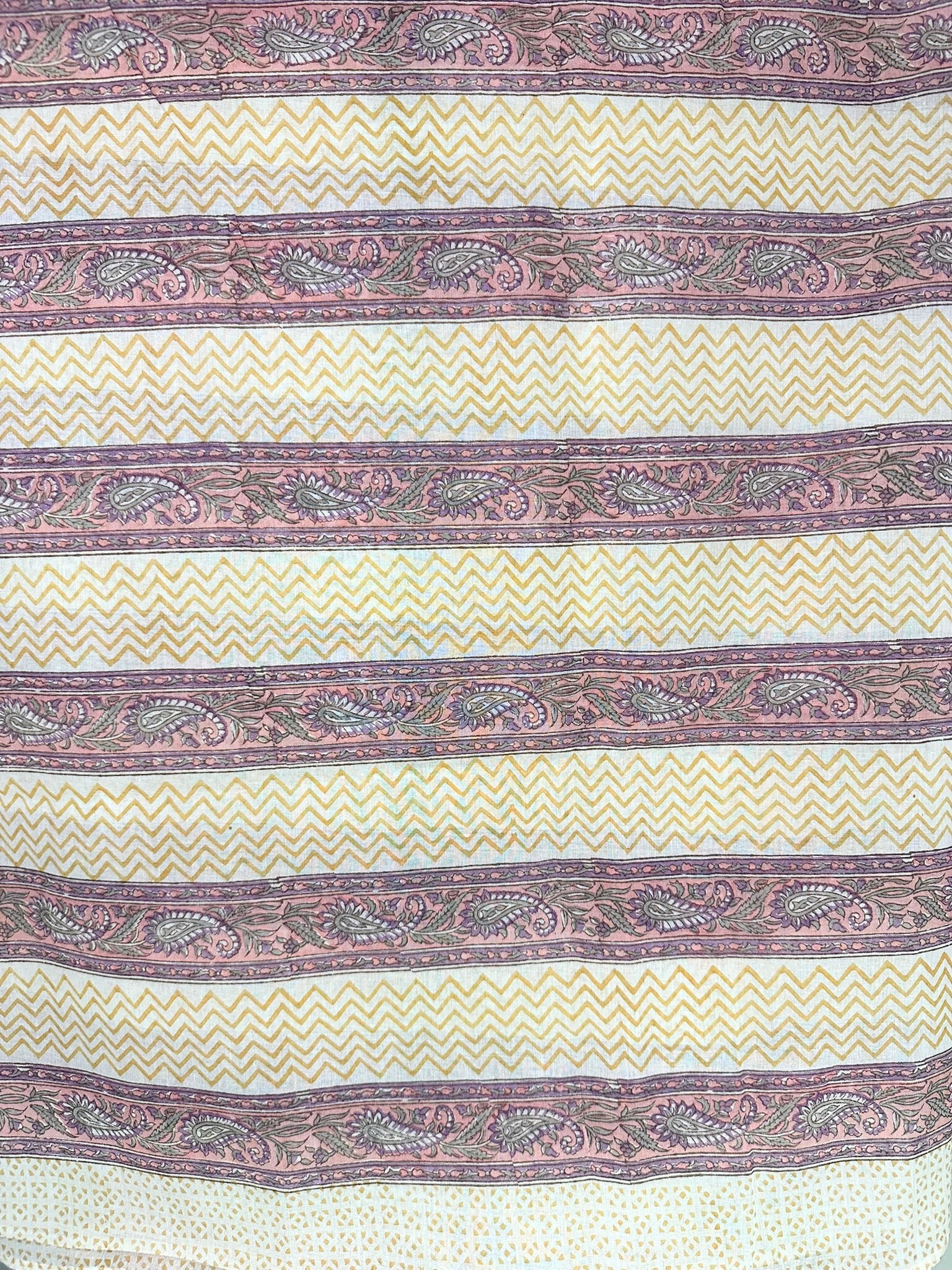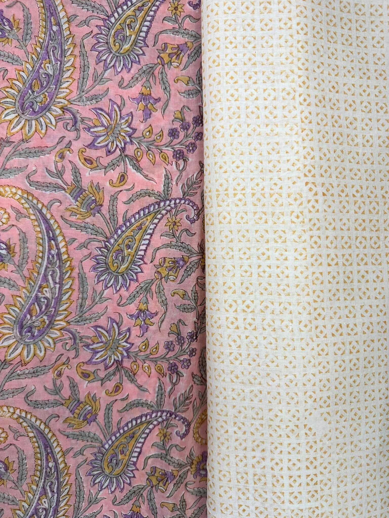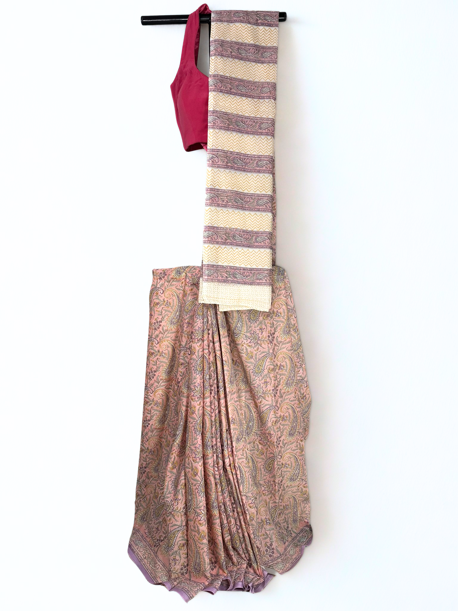 This elegant mul cotton saree features a soft pink base beautifully adorned with intricate purple floral hand block prints. The combination of delicate motifs and airy mul cotton fabric gives it a refreshing, feminine charm. Lightweight, breathable, and effortlessly graceful, this saree drapes beautifully and is perfect for daytime outings, festive gatherings, and refined everyday wear. A timeless piece that blends comfort with handcrafted artistry.