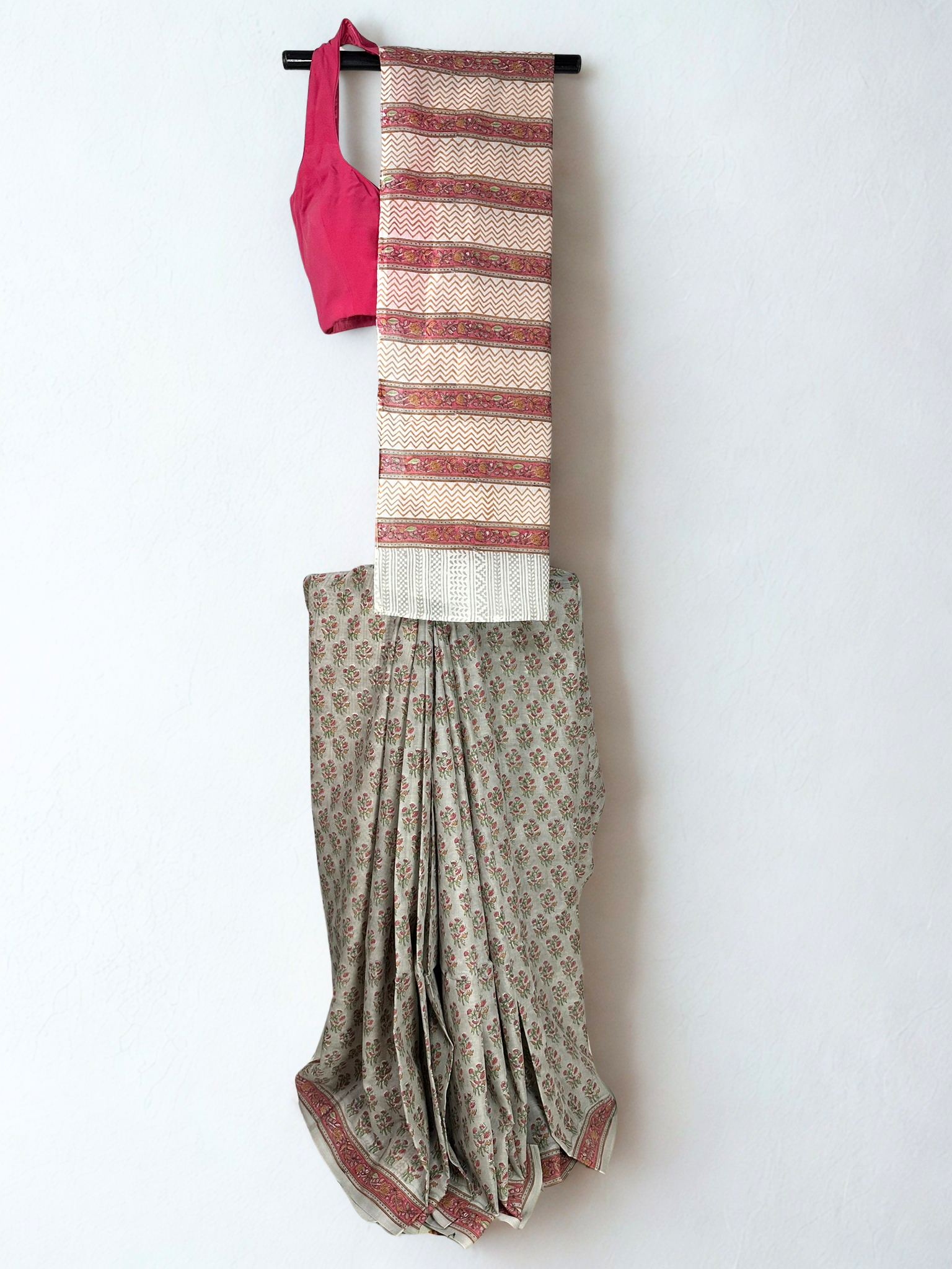 This elegant grey mul cotton saree features delicate small booti motifs, hand block printed with traditional craftsmanship. The soft and breathable mul cotton fabric drapes effortlessly, offering all-day comfort with a touch of understated charm. Perfect for everyday sophistication, casual gatherings, and warm-weather occasions.